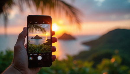 A hand holds a smartphone, framing a stunning sunset over a tropical landscape, with vibrant colors reflecting on the water. This image beautifully illustrates the fusion of technology and nature, inviting viewers to appreciate the serene beauty of the moment.