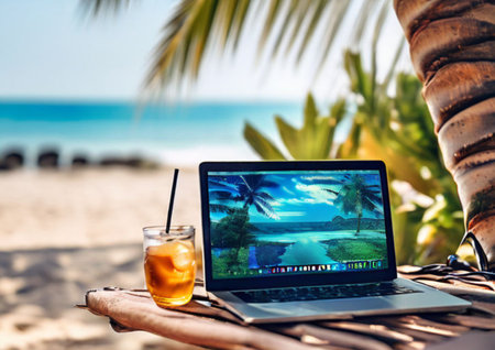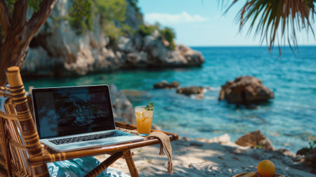 Perfect remote working setup by a crystal-clear teal ocean, laptop mirroring the seascape