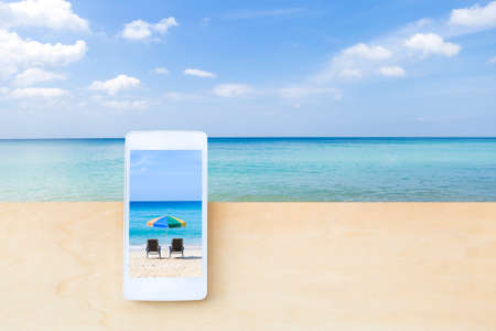 Smartphone with beach photo on wooden table with beautiful beach background, holiday online booking