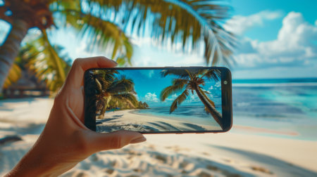 A person holding a cell phone up to take pictures of the beach, AI