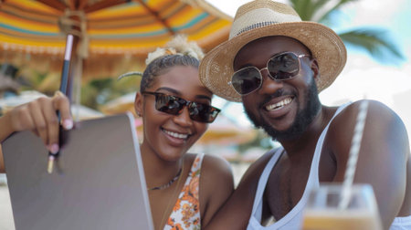 Generative AI : Laughing parents with boy and girl in vivid swimsuits smiling at camera standing on tropical shoreline