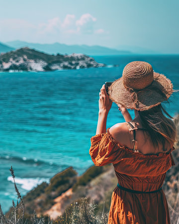 Young woman in a straw hat and dress taking pictures of the sea