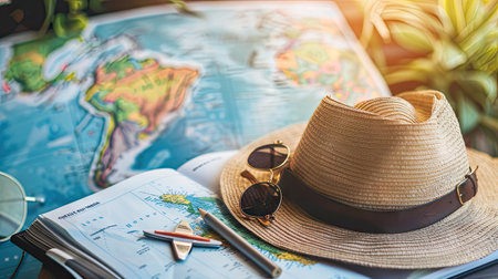 A vibrant travel scene featuring essential items on a world map, including a camera, sunglasses, and hat, perfectly capturing the spirit of adventure and exploration.