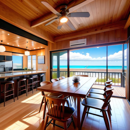 A cozy beachfront cafe interior showcasing wooden furniture and an inviting ocean view. Perfect place for relaxation and enjoyment by the sea.