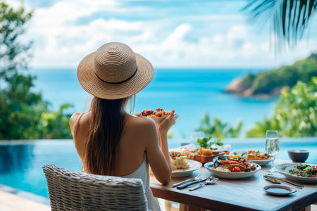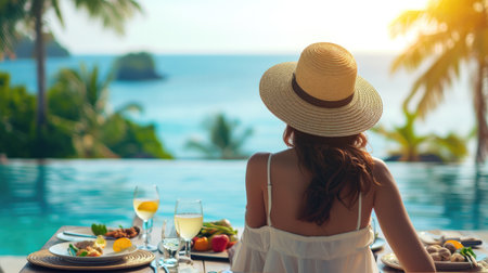 Dinner with sea view in luxury hotel. Woman in straw hat near swimming pool, eating food and enjoy ocean view. Dinner table on tropical vacation. Back view. Concept of travel, holidays, weekend.
