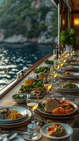 Dining Room Buffet, fine brunch a board the luxury yacht in the evening. AI Generative.