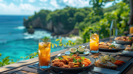Dining with a view at a seaside location featuring vibrant dishes and refreshing beverages during a sunny day