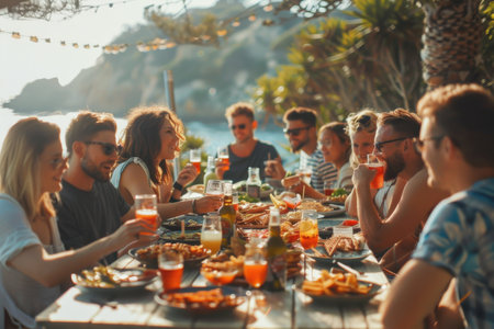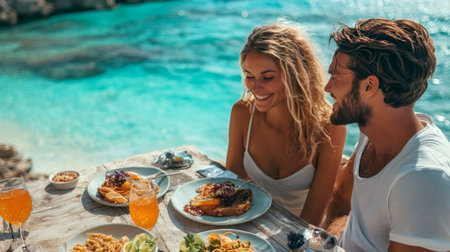 Caucasian young adults dining by the ocean with tropical platters