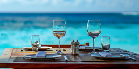 : A serene dining setup by the sea with elegant wine glasses reflecting the crystal-clear turquoise waters.
