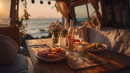 Romantic sunset dinner in a camper van by the sea