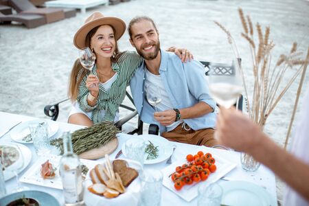Young couple dinning with friends at the beautifully decorated table on the beach near the lake