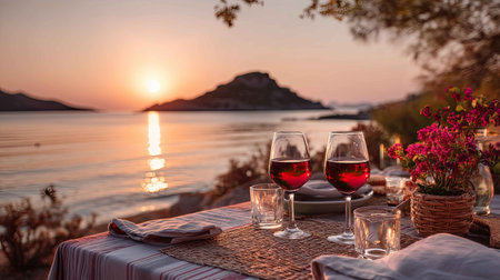 A cozy dining setup featuring two wine glasses and flowers by the water's edge at sunset. This scene captures romance and tranquility on a beach.