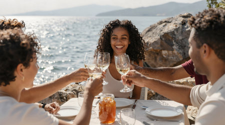 Group of multiethnic friends clinking glasses with champagne and smiling while sitting at table near sea