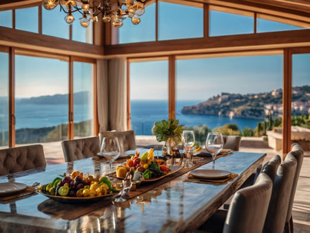 vacation breakfast in luxury hotel with ocean view. Summer love, romance date on vacation concept. AI Generated