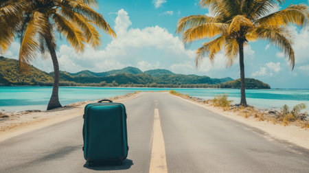 This image captures a vibrant travel scene featuring a lone suitcase on a picturesque road lined with palm trees, overlooking a calm turquoise ocean.