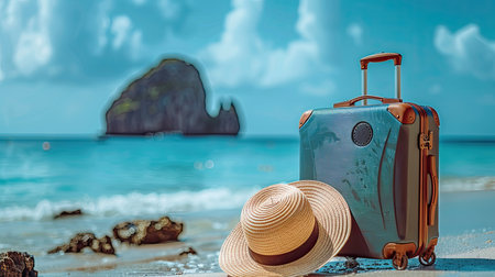 luggage and summer hat on the beach, vacation and travel concept