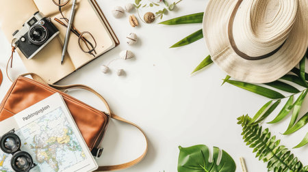 Artistic arrangement of a backpack, hat, camera, book, and map on a table. The visual arts composition includes patterns and textures, creating a unique and aesthetic display AIG50