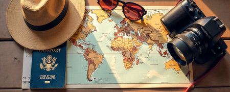 A vibrant travel scene featuring essential items on a world map, including a camera, sunglasses, and hat, perfectly capturing the spirit of adventure and exploration.