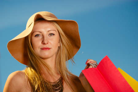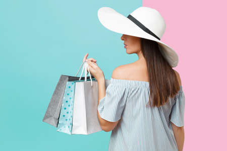 Portrait fashionable elegant fashion beautiful caucasian woman in summer dress, white large wide brim sun hat holding packages bags with purchases after shopping isolated on blue pastel background
