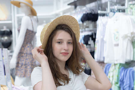 Young cheerful girl posing in shop of accessories trying on straw hat and looking at mirror while shopping in mall.