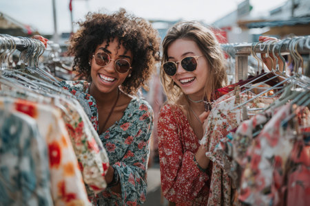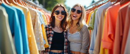 Two cheerful young women stand side by side, beaming with joy amidst a vibrant array of clothing hanging on a rack. Their stylish outfits and sunglasses reflect a sunny day, capturing the essence of friendship and the thrill of shopping in a lively outdoor market.