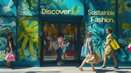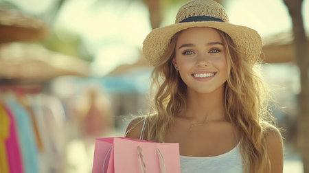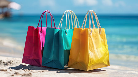 Vibrant shopping bags sit on the sand, reflecting the joyful atmosphere of summer. Shoppers enjoy the seasonal discounts while relaxing by the ocean waves.