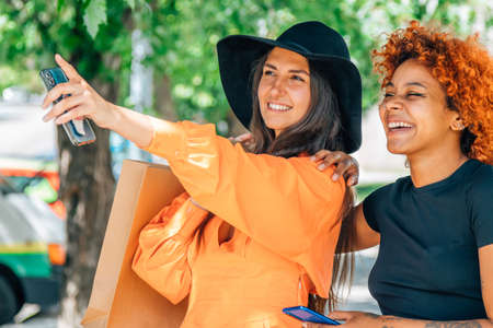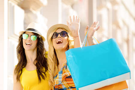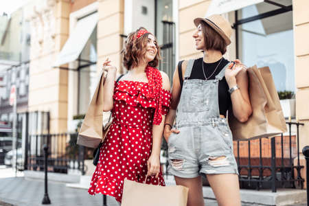 Two female friends are shopping in the city. Attractive girls with shopping bags