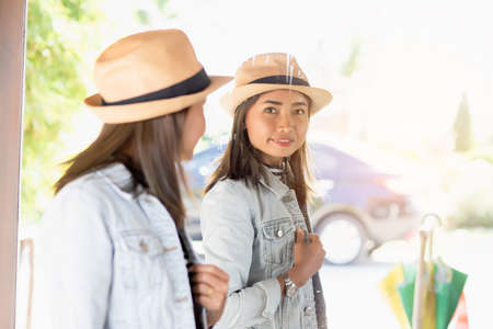Asian women spending their free time shopping at the mall and chatting together while holding shopping bag