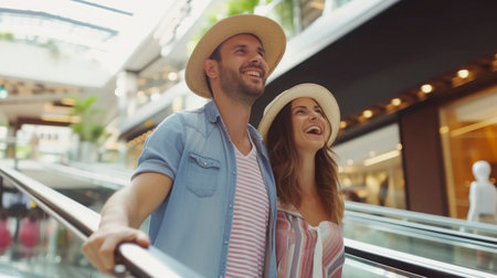 Happy couple moving down on escalator while shopping at mall