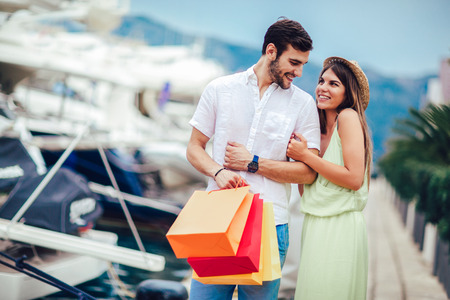 Happy young couple with shopping bags walking by the harbor of a touristic sea resort with boats on background