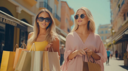 Enjoying shopping together Rear view of two beautiful young women holding shopping bags and looking over shoulder with smile while standing outdoors : Generative AI
