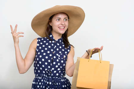 Portrait of young beautiful tourist woman against white background