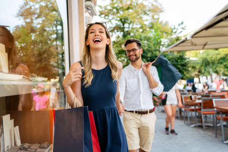 Carefree couple with shopping bags enjoying in city while shopping and talking to each other.