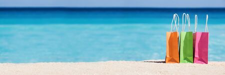 Shopping bags on sand against turquoise caribbean sea water. Tropical celebration on beach. Summer holidays