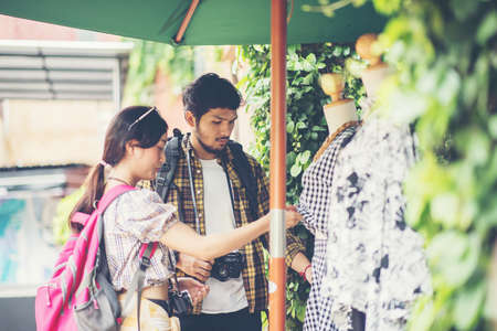 asian couple tourist walking in souvenir market shop