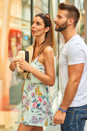 summer holiday of a couple walking on shopping centre in asia
