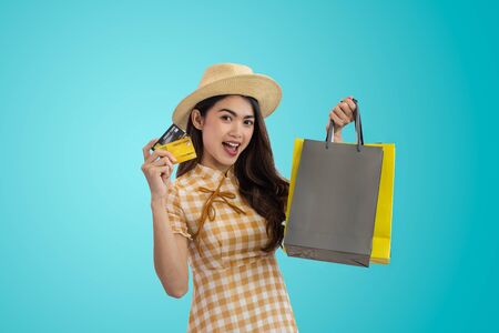 Young happy Asian woman holding shopping bags and showing credit card isolated on blue