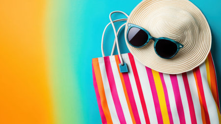 This captivating flat lay image showcases vibrant summer accessories, including a colorful tote bag, stylish sunglasses, and a classic straw hat, ideal for beach days.