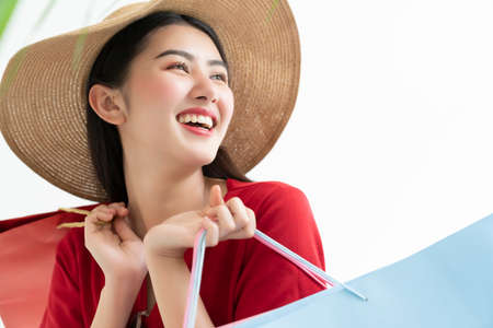attractive beautiful asian woman red dress hand hold shopping bag big smile with happiness and joyful white background