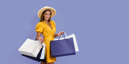 Portrait of beautiful smiling young woman with shopping bags looking away wearing white striped shirt, summer black round straw hat on blue background, banner blank copy space for advertising text