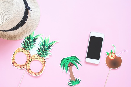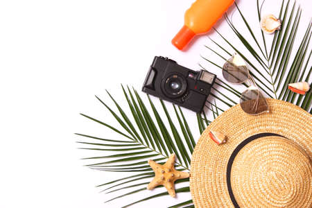 Top view of smartphone, straw hat, sunglasses and palm leaves on white background