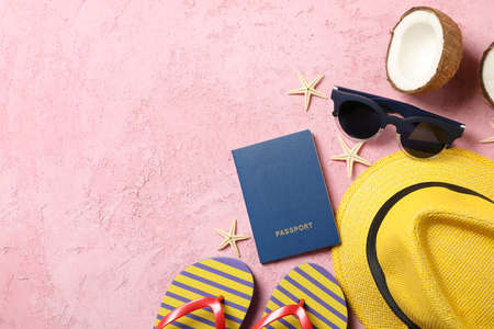 Flat lay of summer items and passport, Travel concept on white background with copy space
