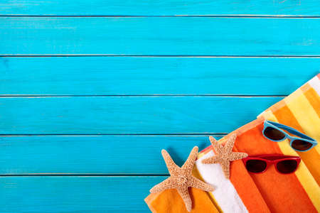 Summer time on a cool view on painted light blue wood table with sunglasses and starfish
