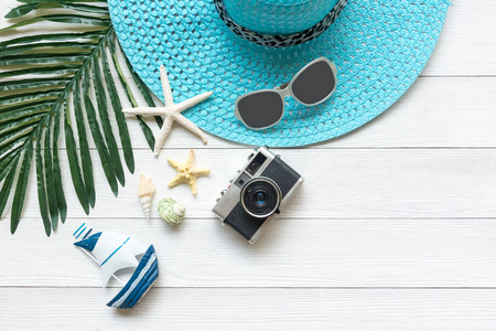 Summer Fashion, camera, starfish, sunblock, sun glasses, hat. Travel and vacations in the holiday, wood white background. Summer Concept.