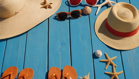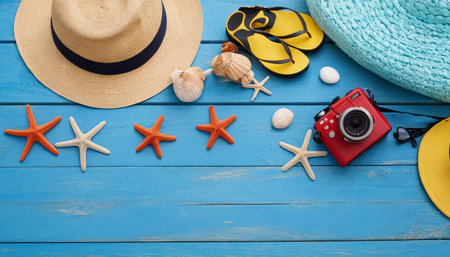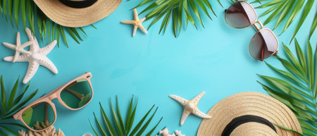 A flat lay showcasing various summer beach vacation essentials. Items include sunglasses, a straw hat, seashells, starfish, and palm leaves on a blue wooden background.