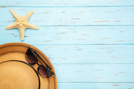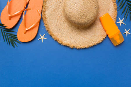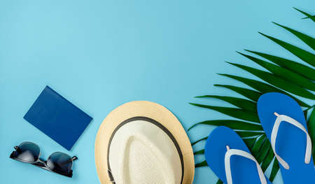 Hat, sunglasses, sunscreen, beach slippers and starfish with palm leaf on a blue wooden background with copy space, summer background.