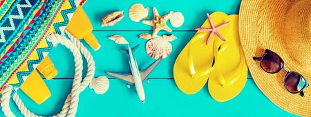Summer holiday vacation beach accessories flat lay top view with copy space