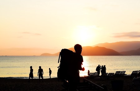 tourists came to the ocean. a group of tourists with backpacks walk along the ocean shore. AI generated