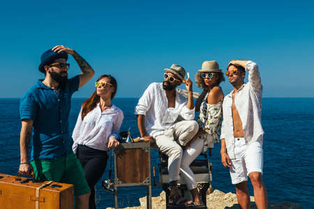 Portrait of elegance multiethnic group of people posing in sunglasses on antique barber chair with suitcase