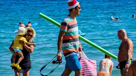 KONAKLI, ALANYA, TURKEY - 06 JULY 2018: Man with red Santa hat and crowd of tourists on the beach. Summer vacation holidays relax. Having fun and joy concept. Blue sea on the background